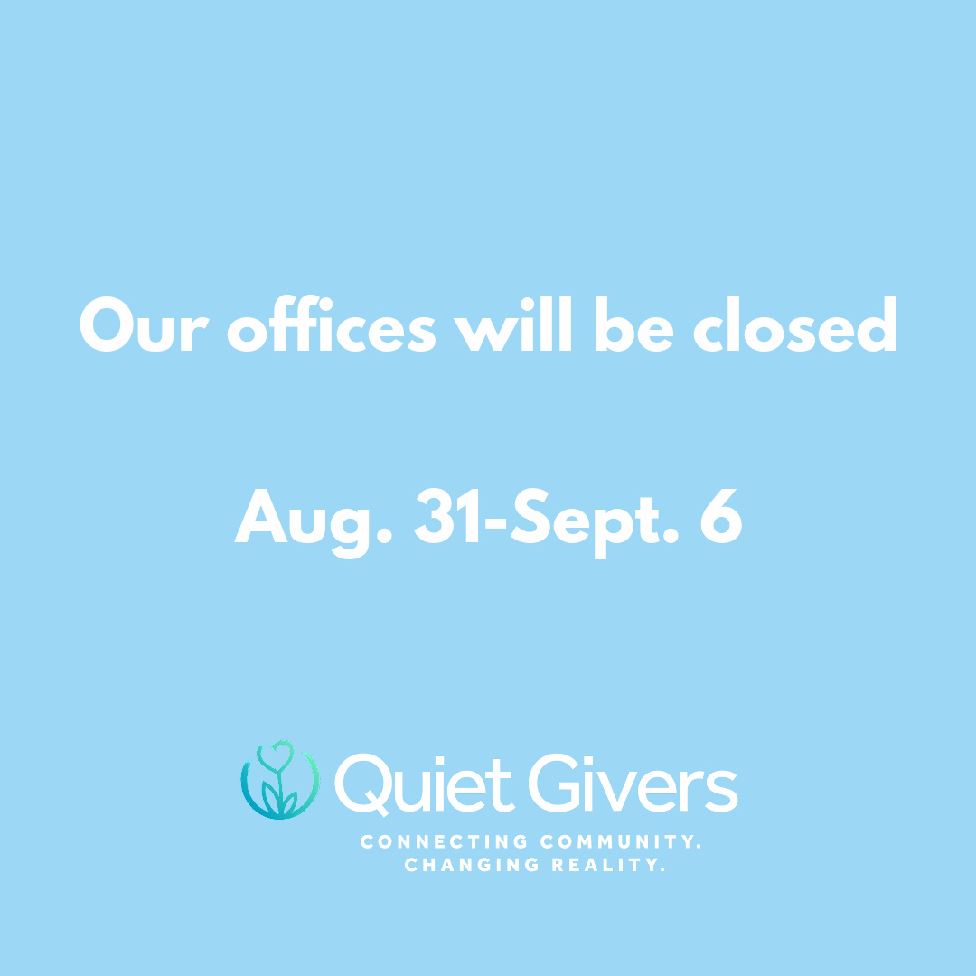 Quiet Givers' offices will be closed for vacation for one week from Tuesday, Aug. 31- Monday, Sept. 6. We will be unable to respond to any messages, emails, or calls during this time. If you have an emergency need, please visit our resources page (CLICK HERE) for a list of other organizations that may be able to help. We will do our best to respond to all messages and needs we receive when we return on Tuesday, Sept. 7....