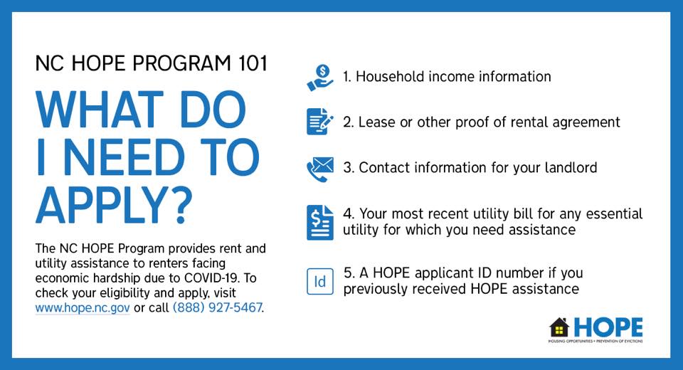 Need rent or utility assistance? Apply for the NC HOPE program! NC HOPE is providing assistance to those who are experiencing economic hardship due to the COVID-19 pandemic. Apply at the link below!